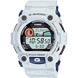 Because it's a G-Shock, it is shock resistant and built to last a lifetime.Cool colors and a slick design combine to give you the Men's G-Shock Rescue Watch from reliable designer Casio. With a large digital dial that is divided into sections for locating information quickly and easily, this modern timepiece offers tide and moon data, World Time with 29 time zones, five alarms, countdown timer, stopwatch, 12- and 24-hour formats, and day, date, and month information. Contrasting blue and black accents detail the case, and the durable white resin strap closes with a buckle clasp. An EL backlight makes viewing easy in any light conditions, and large buttons are handy for operating the wide range of functions. Able to survive the toughest environments with its shock resistant technology, water resistant depth of 660 feet (200 meters), and low temperature resistant LCD, this dynamic watch is ideal for marine or outdoor enthusiasts as well as everyday adventurers. Read more
